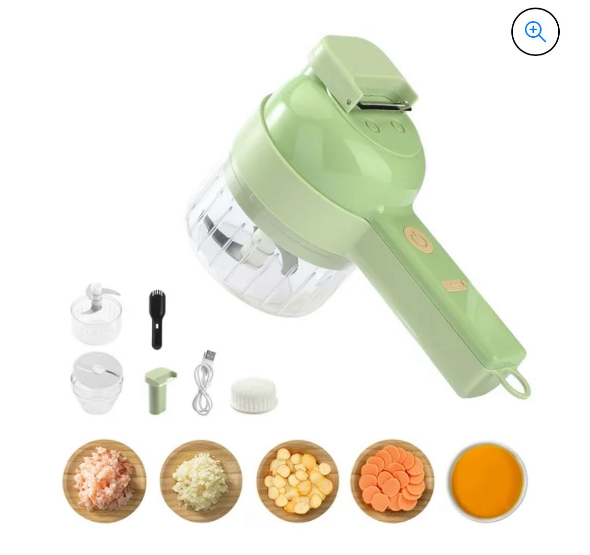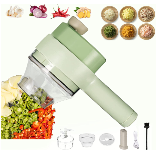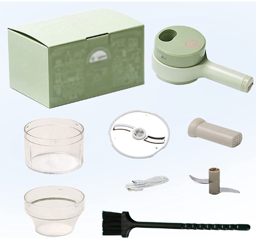 - El paquete incluye: 1 Cortador de verduras eléctrico, 1 Rebanador, 1 Cepillo de limpieza, 1 Espátula, 1 Alimentador, 1 Cable de datos.